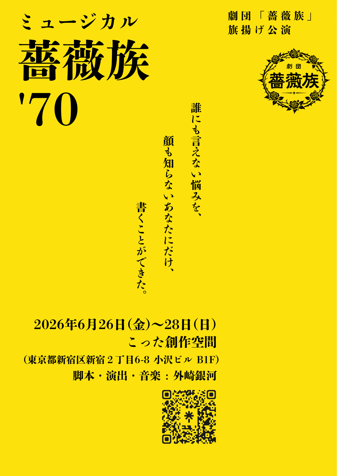 クィア当事者の視点から演劇を創作する新劇団「薔薇族」による旗揚げ公演、ミュージカル『薔薇族ʼ70』が、2026年6月26日(金)~28日(日)の3日間、新宿二丁目の「こった創作空間」にて上演される。