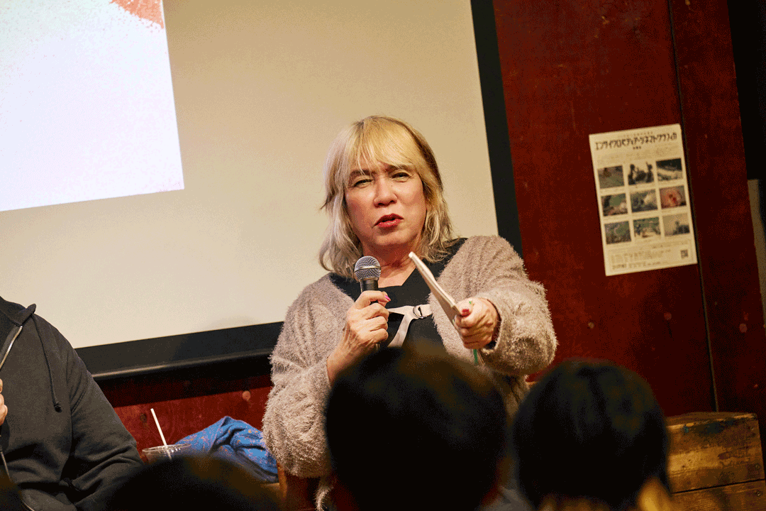この夜、ゲスト登壇したのは、薬物依存症回復施設「⼤阪DARC」のディレクターとして薬物依存⽀援の 現場に⻑年関わる倉⽥めばさん(写真)と、東京を拠点に活動するDJで、新宿⼆丁⽬のイベントオーガ ナイズにも携わるDJ POIPOIさん。