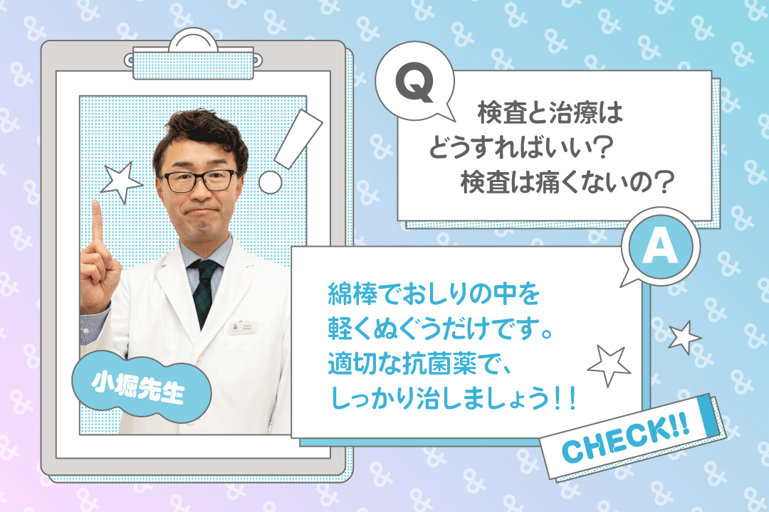 小堀先生:多くの場合、綿棒でおしりの中を軽くぬぐうだけです。数秒で終わりますし、強い痛みはほとんどありません。尿検査だけでは見つからないので、アナルセックスがある人は“直腸検査”を選ぶことが大切です。